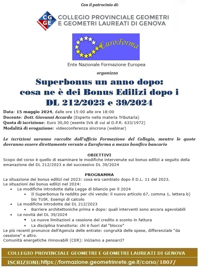 15.05.2024 GEOMETRI GENOVA: WEBNAR : Superbonus un anno dopo: cosa ne è dei Bonus Edilizi dopo i DL 212/2023 e 39/2024