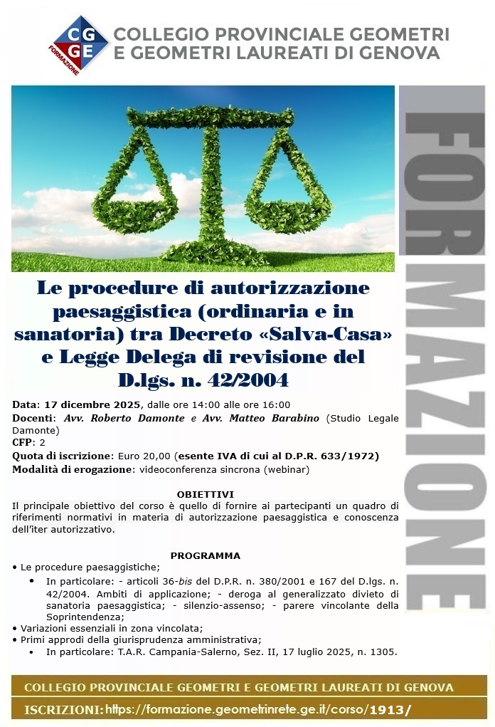 17.12.2025 Geometri GENOVA : LE PROCEDURE DI AUTORIZZAZIONE PAESAGGISTICA TRA DECRETO SALVACASA E LEGGE DELEGA DI REVISIONE DEL D.LGS, 42/2004