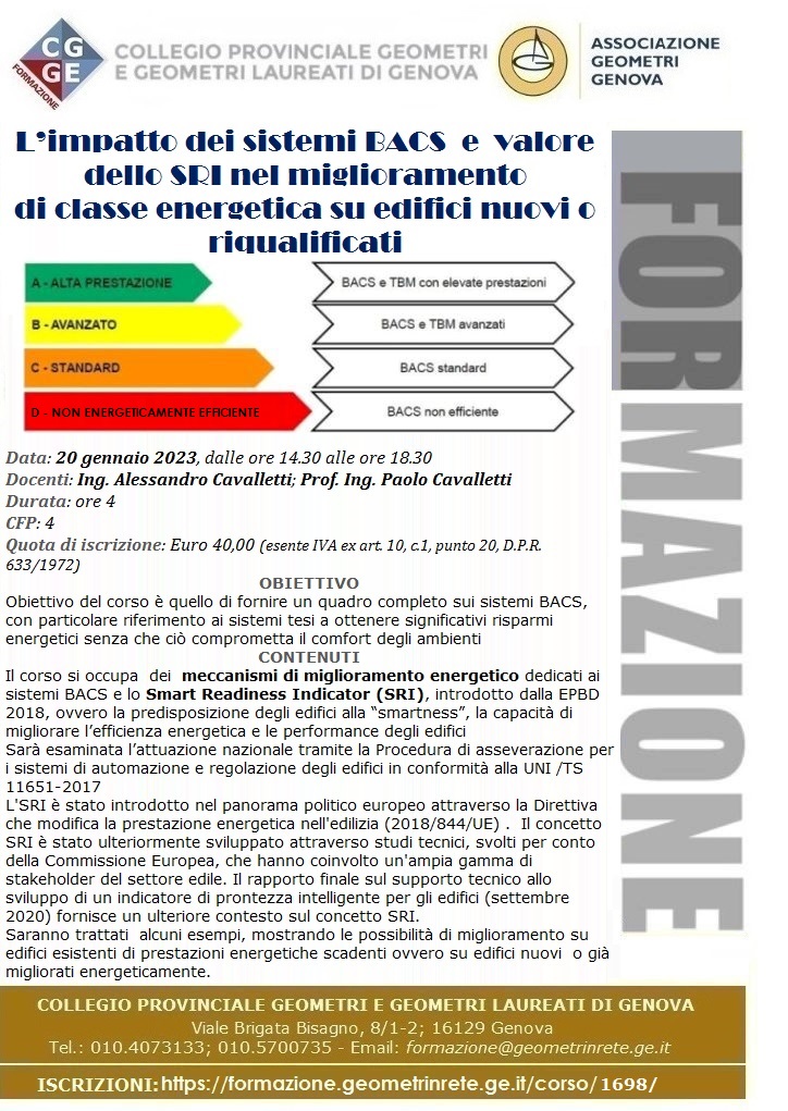 20.01.2023 Formazione Geometri GE : L’impatto dei sistemi BACS e valore dello SRI nel miglioramento di classe energetica su edifici nuovi o riqualificati - 4CFP