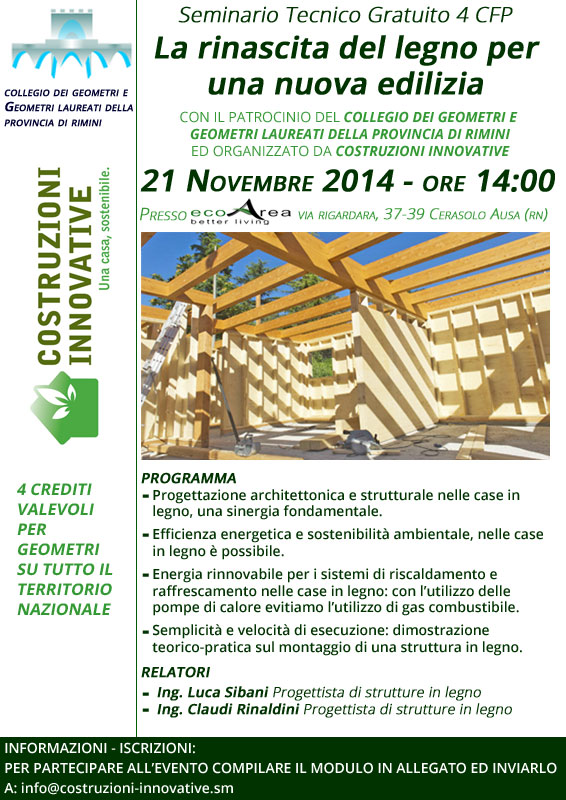 Si comunica a tutti gli Iscritti che venerdì 21/11/2014 presso Ecoarea Better Living – Via Rigardara 37-39 Cerasolo Ausa (RN) avrà luogo il CORSO FORMATIVO dal Titolo : “La rinascita del legno per una nuova edilizia”