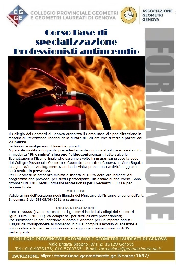 Il corso Base di Specializzazione in materia di Prevenzione Incendi sarà svolto in modalità “Streaming” sincrono (videoconferenza), fatte salve le Esercitazioni e l’Esame finale che saranno svolte in presenza presso la sede del Collegio Provinciale Geometri e Geometri Laureati di Genova, in Viale Brigata Bisagno, 8/1-2.