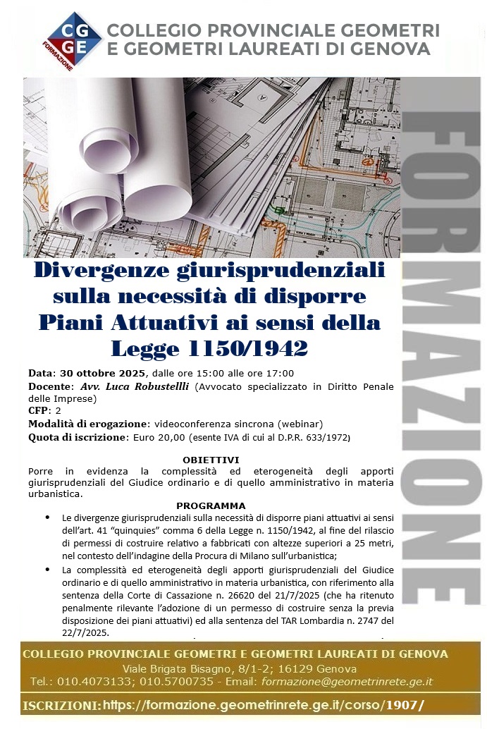 30.10.2025 Geometri GENOVA : DIVERGENZE GIURISPRUDENZIALI SULLA NECESSITÀ DI DISPORRE PIANI ATTUATIVI AI SENSI DELLA LEGGE 1150/1942