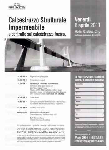 Fima System organizza per il giorno 08/04/2011 presso l'Hotel Globus city - Via Imperatore Traiano, 4 - Forlì un seminario su " CALCESTRUZZO STRUTTURALE IMPERMEABILE E CONTROLLO SUL CALCESTRUZZO FRESCO".
