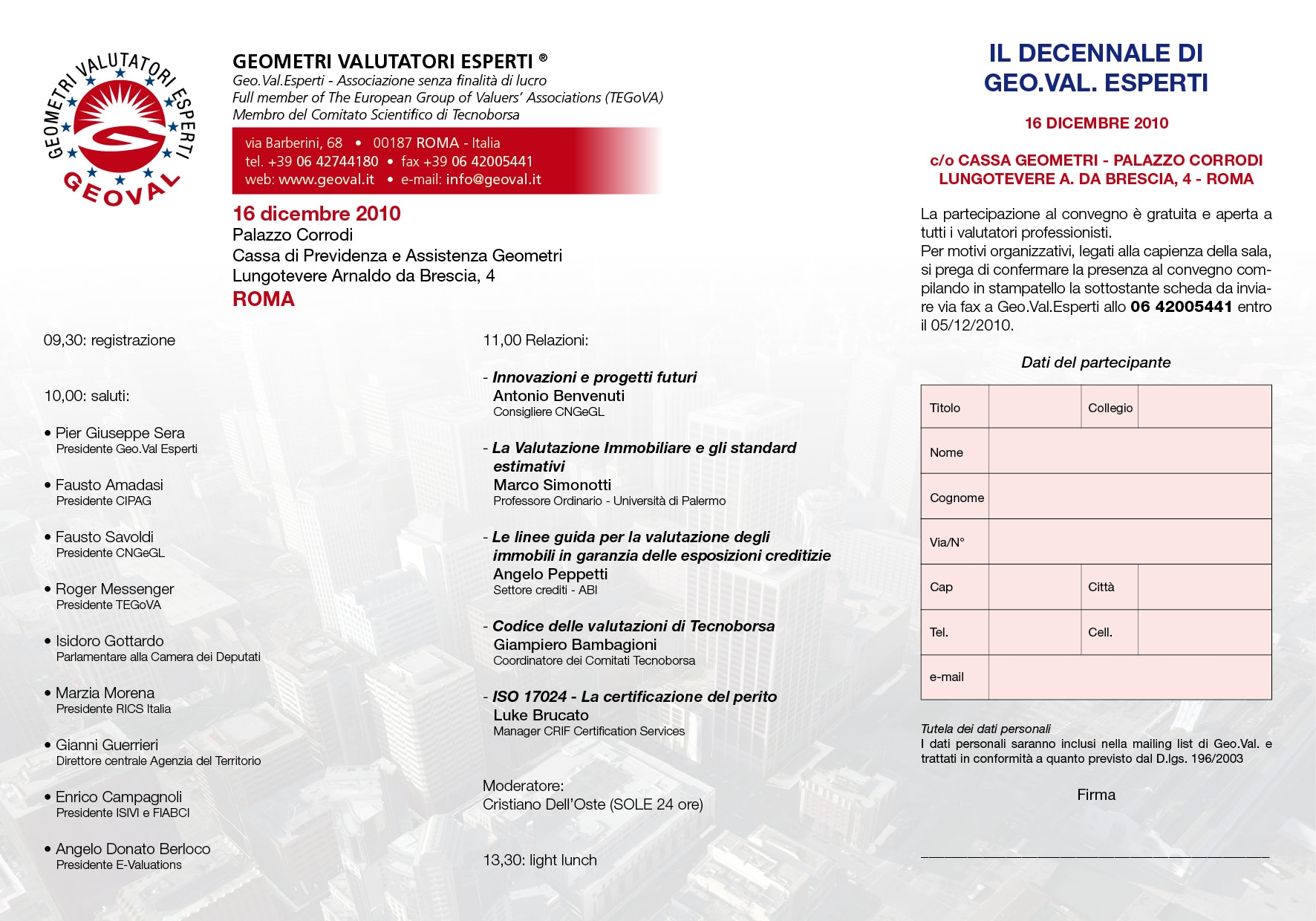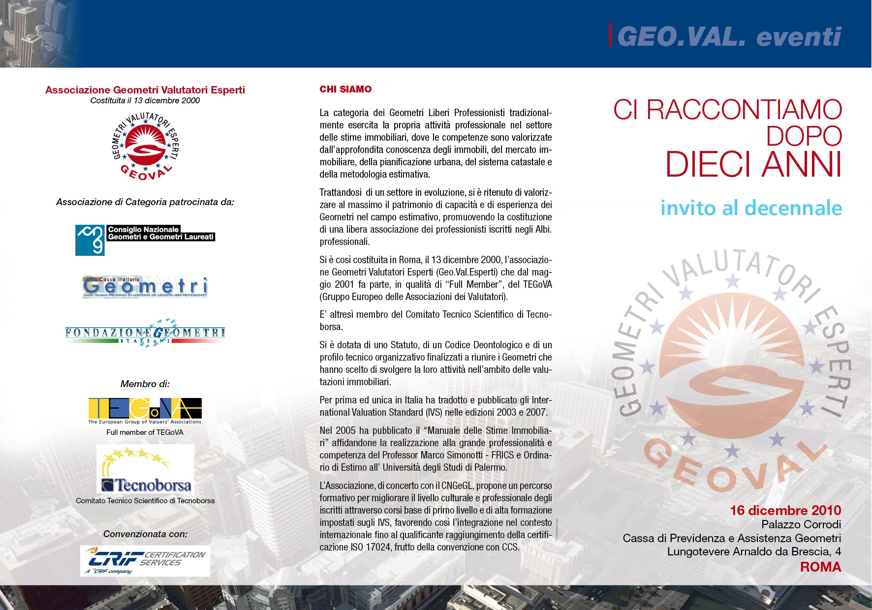 Si comunica a tutti gli iscritti che il 16/12/2010 a Roma presso la CIPAG (Cassa Nazionale Geometri) - Via Lungotevere Arnaldo da Brescia n° 4 - si terrà un evento per ricordare il decennale di fondazione dell'Associazione di categoria Geo. Val.Esperti.