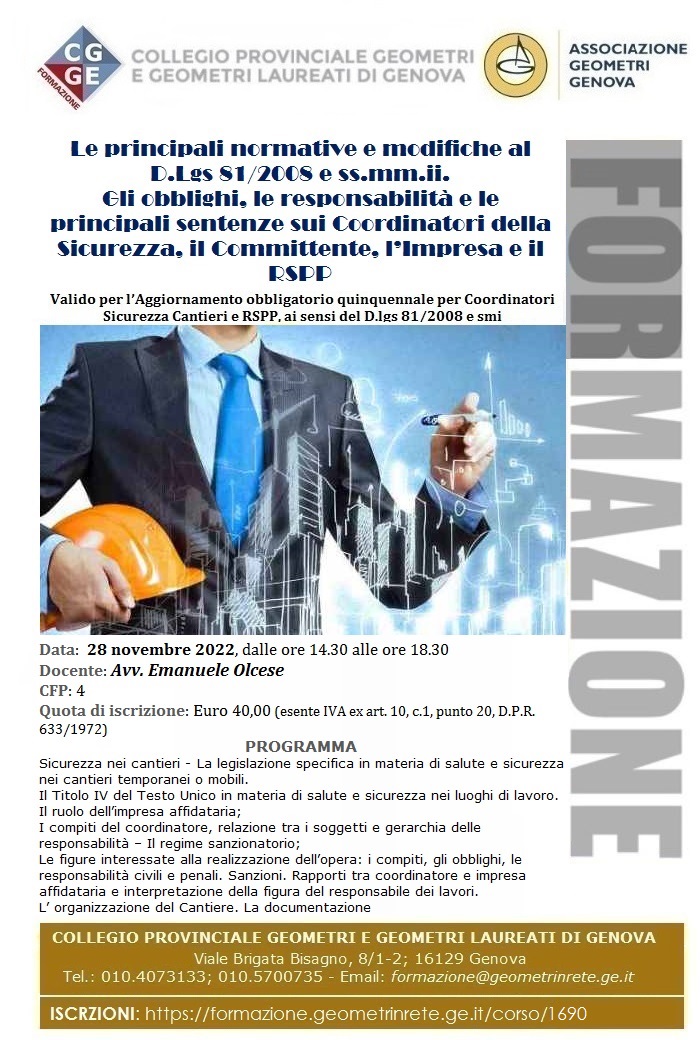 28 novembre 2022 : Corso Coordinatore sicurezza cantieri: "Le principali normative e modifiche al D.Lgs 81/2008 e ss.mm.ii." - 4CFP