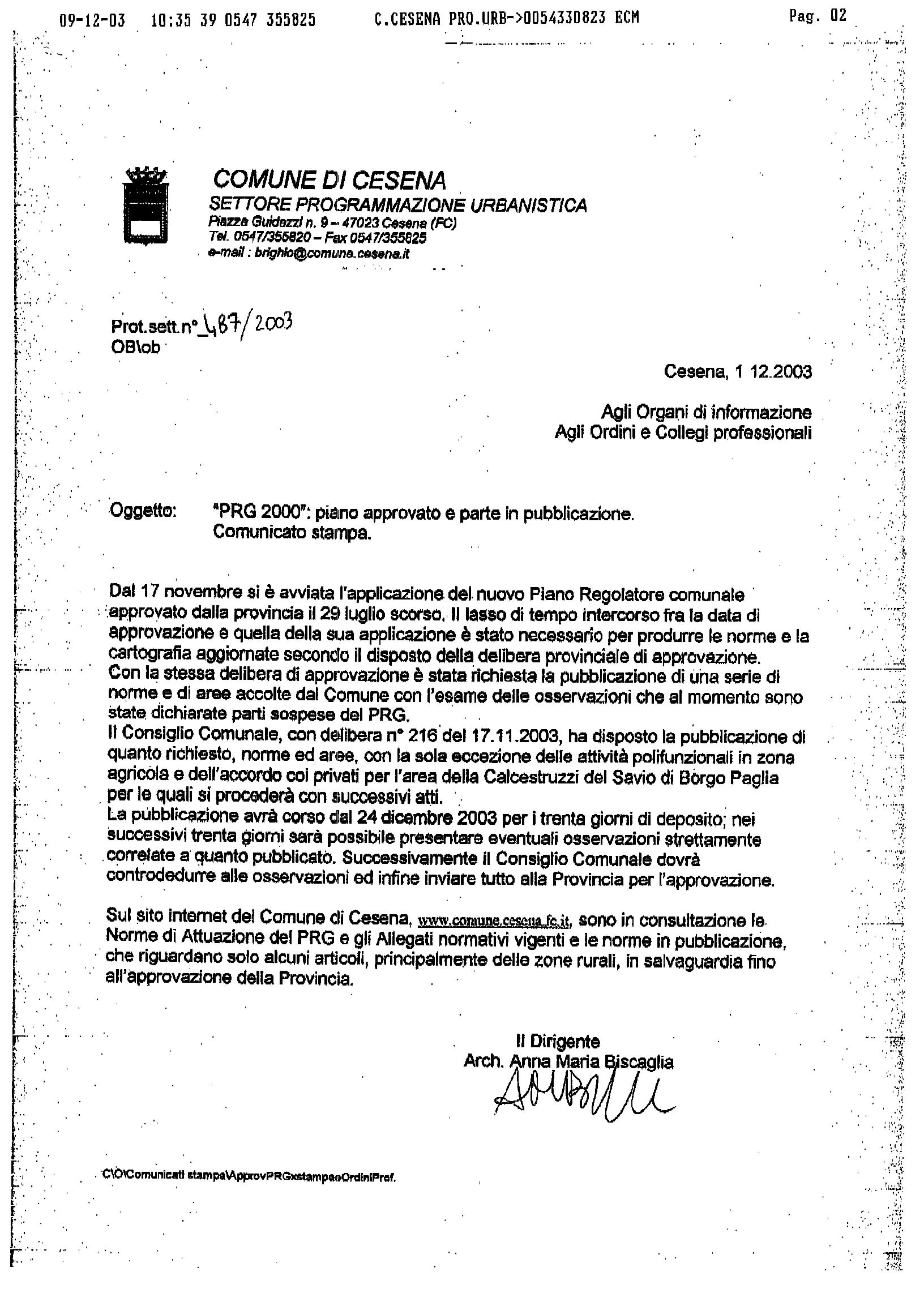 Si allega il comunicato del Comune di Cesena relativo alla approvazione del PRG 2000.