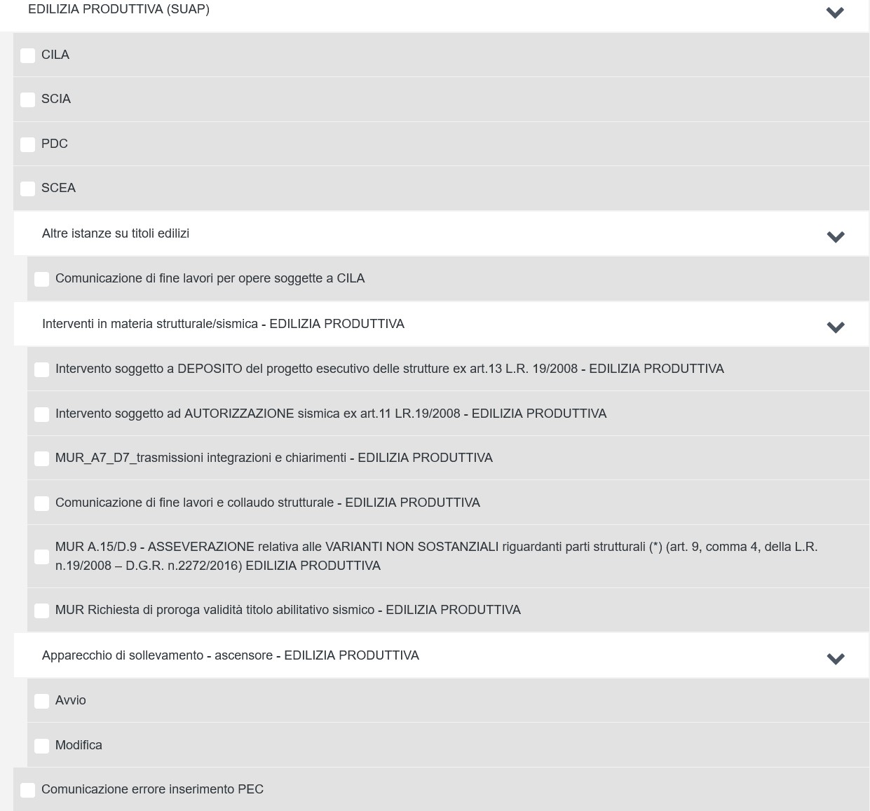 Pertanto, le pratiche relative agli interventi di edilizia produttiva, sopra indicati, devono essere compilate e presentate tramite la piattaforma telematica regionale ACCESSO UNITARIO, non essendo più ammesso il loro invio mediante posta elettronica certificata (PEC), a pena di loro irricevibilità.