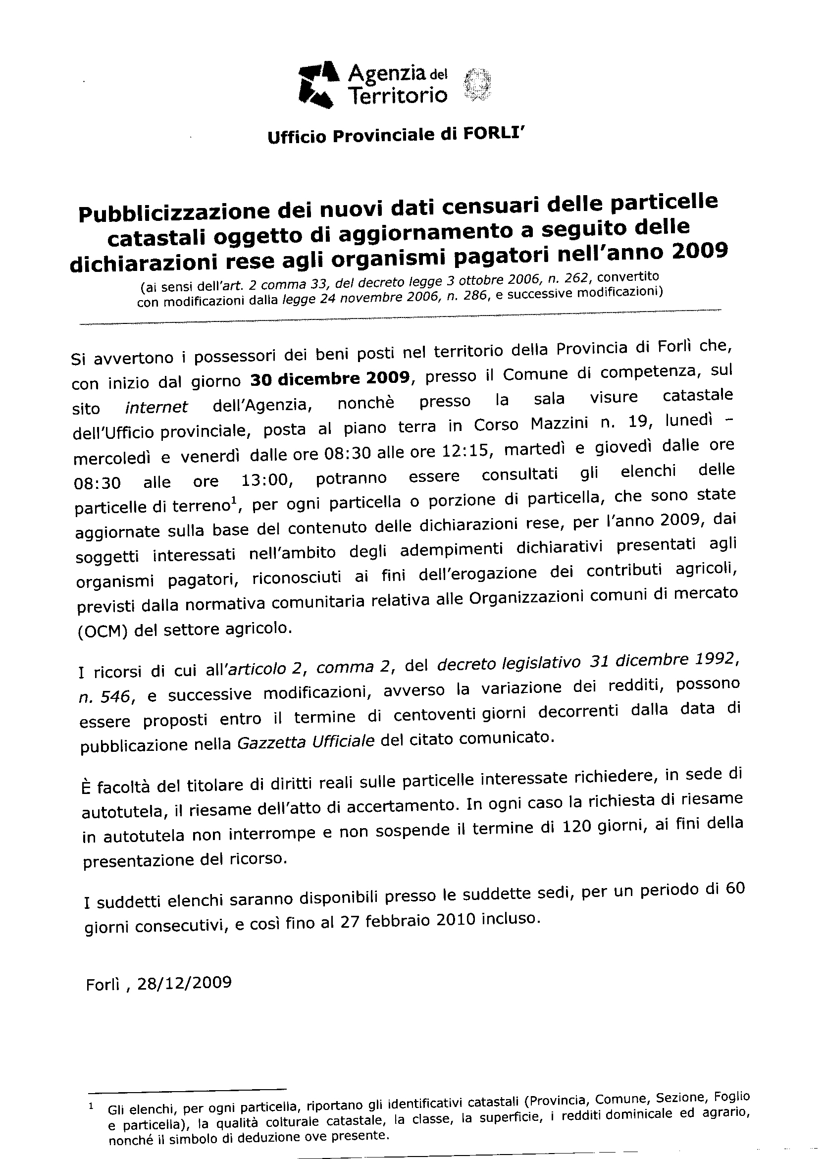 Si invia il comunicato dell'Agenzia del territorio - Uff. Prov.le di Forlì - di cui all'oggetto.